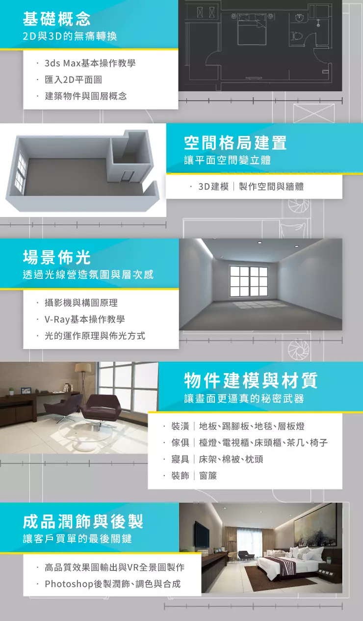 至於 3D 繪圖軟體,將選用目前業界最熱門、主流的 3ds Max 搭配 V-Ray著色引擎,